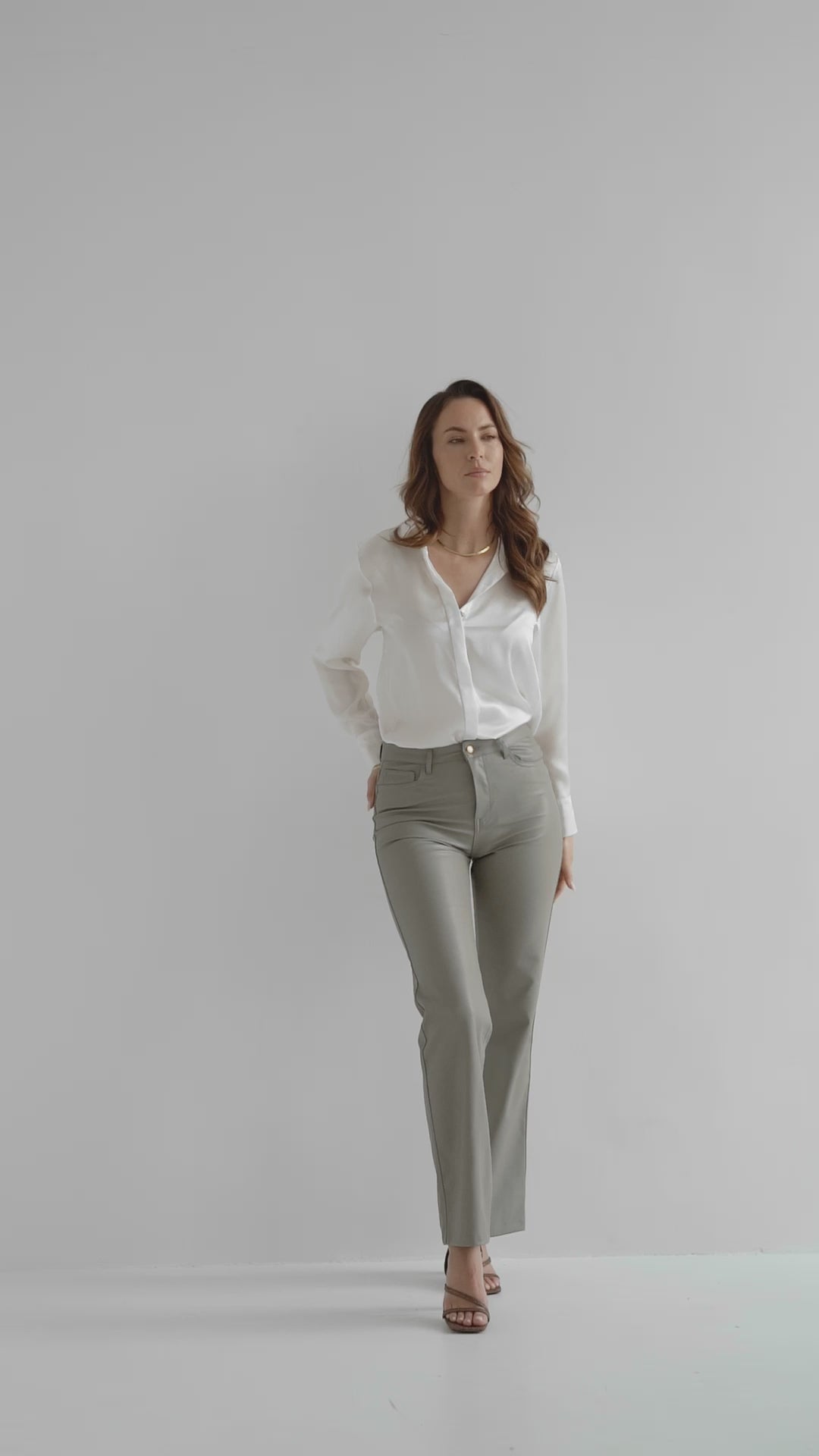 Krój delikatnie oversize, klasyczny kołnierzyk, całość ozdobiona włoskimi guzikami z prawdziwej masy perłowej, które dla zachowania pełni elegancji i łatwości stylizacji zostały przykryte plisą. Aby nadać koszuli więcej charakteru zaprojektowaliśmy długie mankiety podkreślone trzema perłowymi guzikami.